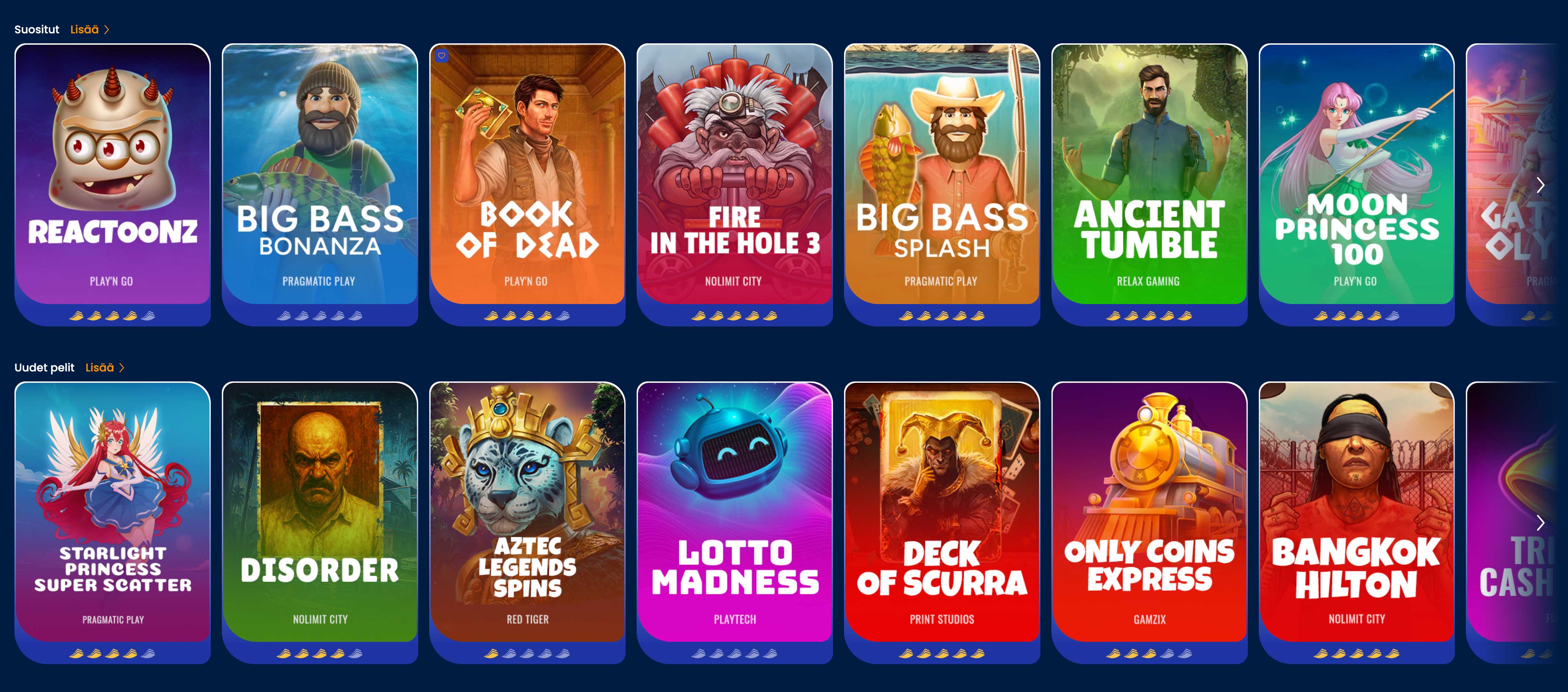 Tarjoamme laajan valikoiman lukuisia hedelmäpelejä, ikonisia pöytäpelejä ja jännittäviä live-pelejä. Olemme myös integroineet erittäin kattavan vedonlyöntipalvelun suomalaisten urheilufanien iloksi.